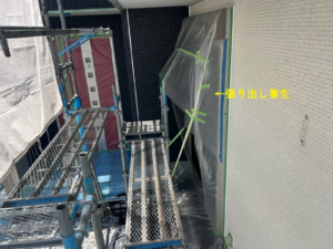 足場組み→高圧洗浄→シーリング→塗装のための養生