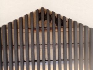 【現状】コウモリは1~2センチの隙間からでも侵入するそうです。内側には防虫ネットが見えますが、手前のガラリ部分には滞留できてしまいますね😥