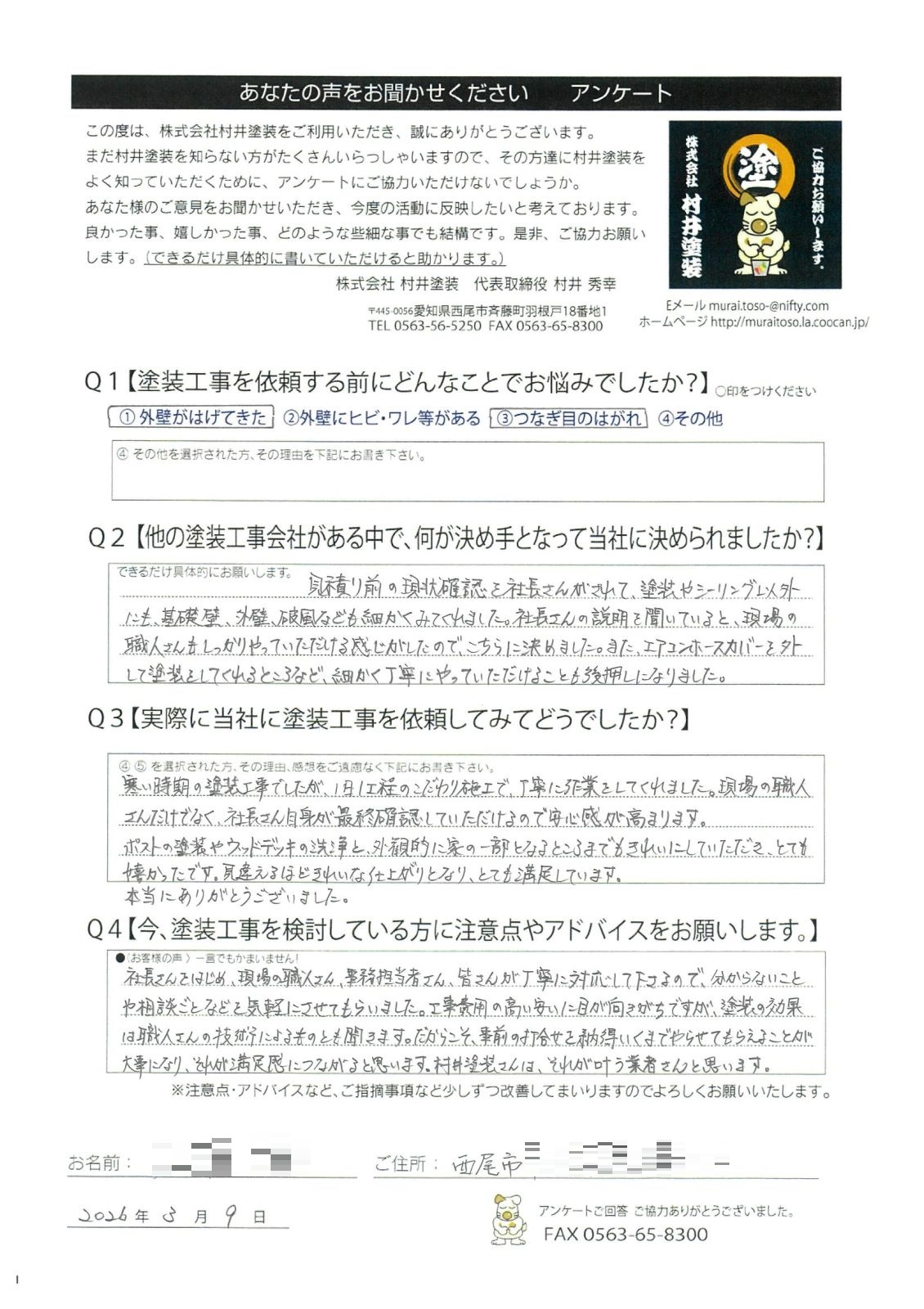 寒い時期の塗装工事でしたが、1日1工程のこだわり施工で、丁寧に作業をしてくれました。現場の職人さんだけでなく、社長さん自身が最終確認していただけるので安心感が高まります。
