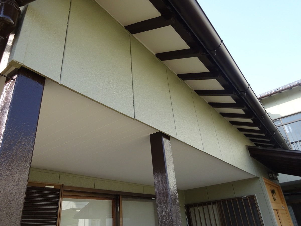 愛知県西尾市『O様邸』【外壁】リファインSi ソルトブッシュ(3分艶)【2F屋根1部分】スーパーフッソコート【付帯部】4Fフッ素塗装【軒天】張替え工事【テラス屋根】ポリカ交換工事【破風】ガルバリウム鋼板巻き工事 ブラウン【屋根工事】谷樋交換、漆喰詰め替え