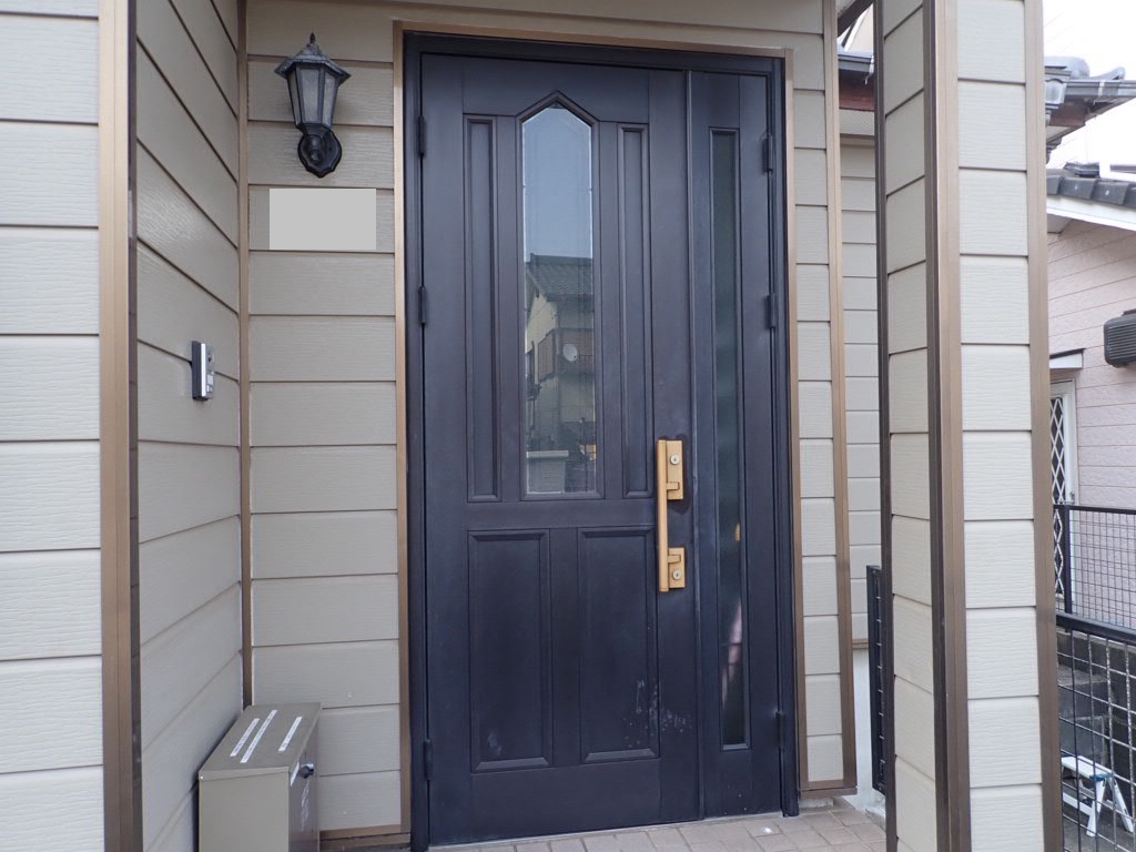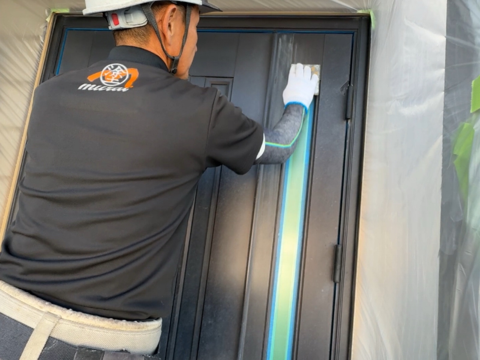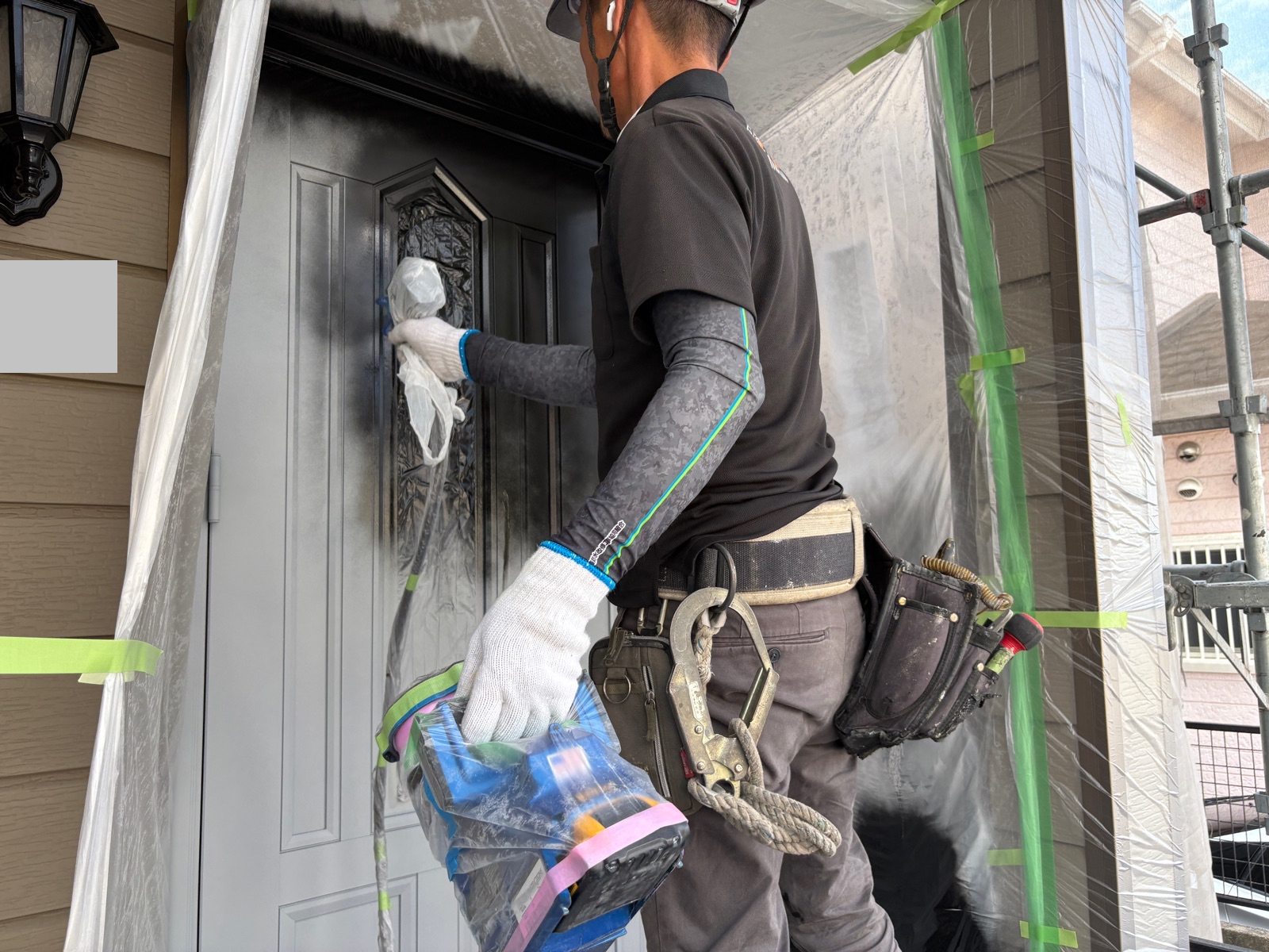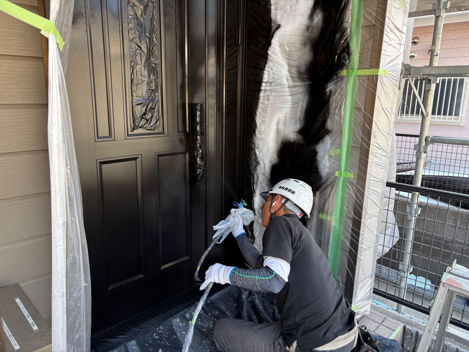 ~アルミ製の玄関扉~ アルミ製の玄関扉は通常、塗装の必要がございませんが、 劣化が進行している場合は 【入念な下地調整】を行うことでメンテナンスが可能となります。 新品同様に見せるため ローラーや刷毛は使用せず【吹付け】を行いました。 吹付けとは、 専用の機械を使って、塗料を霧状にして吹き付ける塗装工法です。 塗料が微細な粒子となり、均一に表面を覆うため、 手塗りでは難しい細部や複雑な形状にもムラなく密着します。 下塗りは 密着性の良いエポキシ系を使用 仕上げ材は フッ素塗料×2回を均等に吹付けし、 艶はアルミ素材に見せるため3分艶を選択。 施工後は新品同様に蘇り、お客様の素敵な笑顔を見る事が出来ました✨✨ 木製でしたらDIYが可能ですが、アルミ製は難易度が高く 下地調整のやり方、塗料の選び方、吹付け方、どれも経験や技術を要します。 アルミ製で色剥げが進行している玄関扉でお悩みの方 村井塗装までお気軽にご相談ください(*^_^*) |