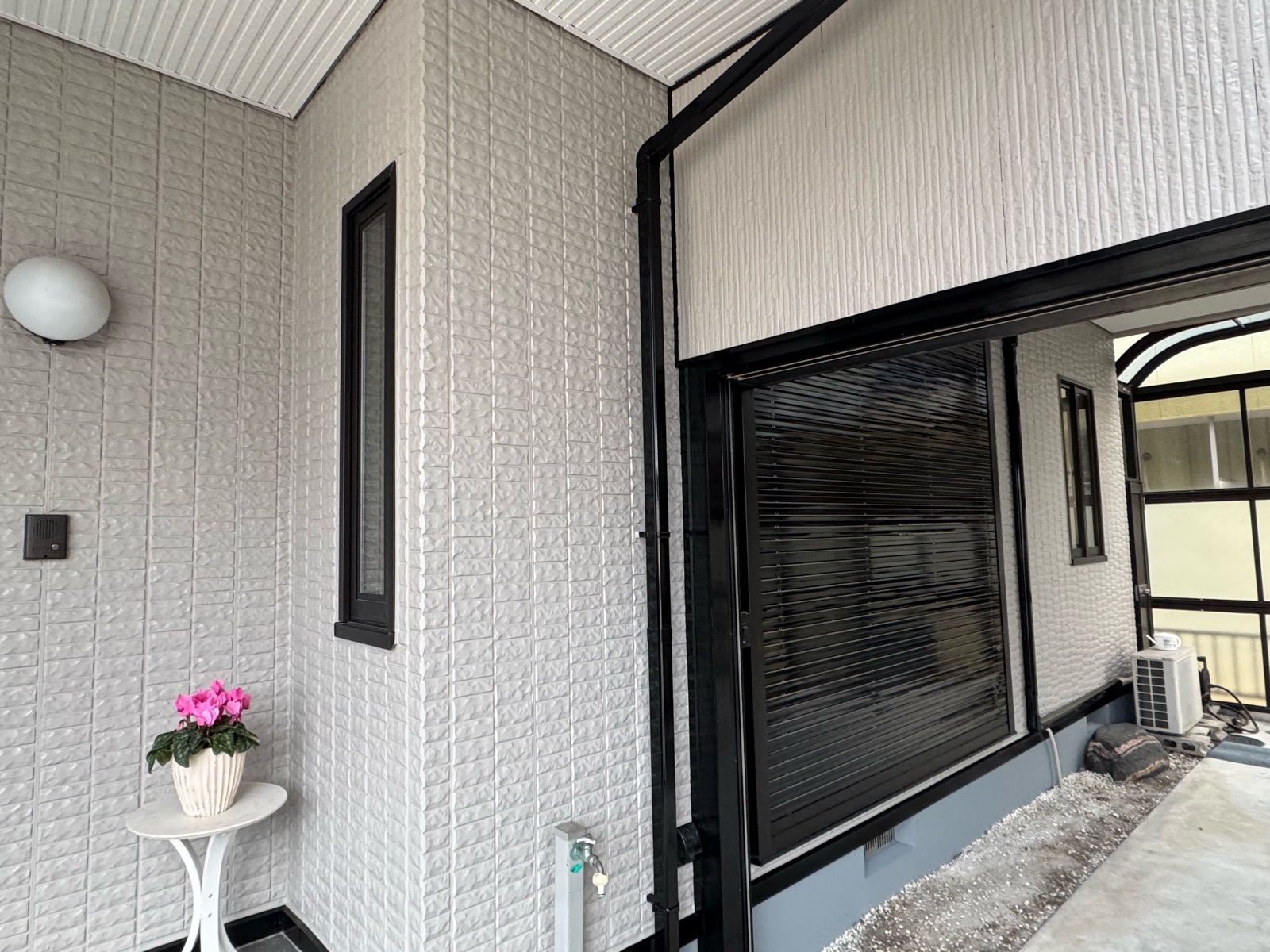 この度は村井塗装へご依頼くださり 誠にありがとうございます。 I様邸、 以前の雨漏り工事に続き、今回は外壁塗装工事をご依頼いただきました。 色決めは3回のカラーシミュレーションを行い【バーチグレー 3分艶】に決められました。 黄みがかった明るめのグレーでオシャレで落ち着いた外壁にしたい方に人気のカラーです(^_-)-☆ フード以外の付帯部はサッシ色に合わせて黒! (フードは目立たせないように外壁と同色に) 明るめのグレー外壁に、付帯部を黒でまとめることで上品さと引き締まった印象です(^_-)-☆ 色のコントラストが美しく、お家全体が引き締まって見えるデザインに仕上がりました!! 今回の工事は塗装だけでなくテラスのポリカも全て新品交換いたしました。 明るく丈夫なポリカで強度と採光性がグッと向上!! 外壁の仕上がりと調和した明るく心地よい空間になりました✨ 再度お声がけいただけることは、私たちにとって何よりの励みです(^_-)-☆ 毎回、工事の際は職人へ優しくお気遣いいただき本当にありがとうございます。 これからも末永く安心して過ごせる住まいづくりに努めてまいります!! また何か気になる点などございましたら お気軽にご連絡ください。 本当にありがとうございましたm(__)m |