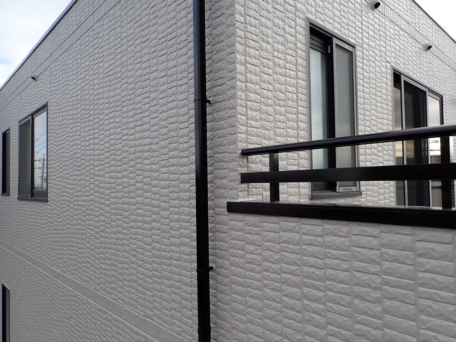 【外壁】超低汚染リファイン無機-IR(アステック)8081バーチグレー(3分艶) 【軒天】溶剤系ケンエース(日本ペイント)N-90 【付帯】スーパーフッソコート(澤政興業)黒 【基礎壁】シリコン浸透ガード(日本ペイント)モルタルグレー |